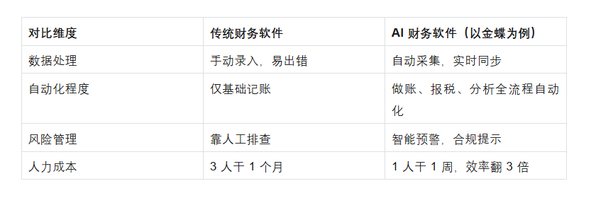 以金蝶 AI 驱动的财务软件(如金蝶云星辰、精斗云)为例,直接戳中痛点: