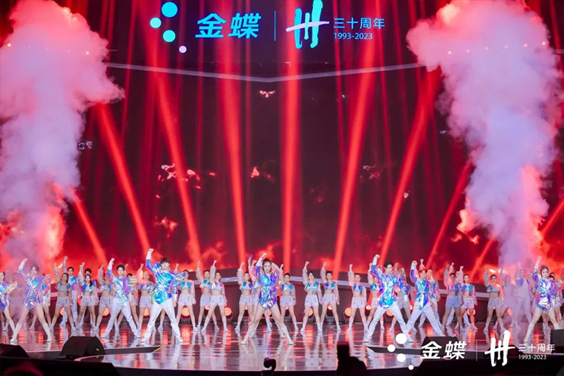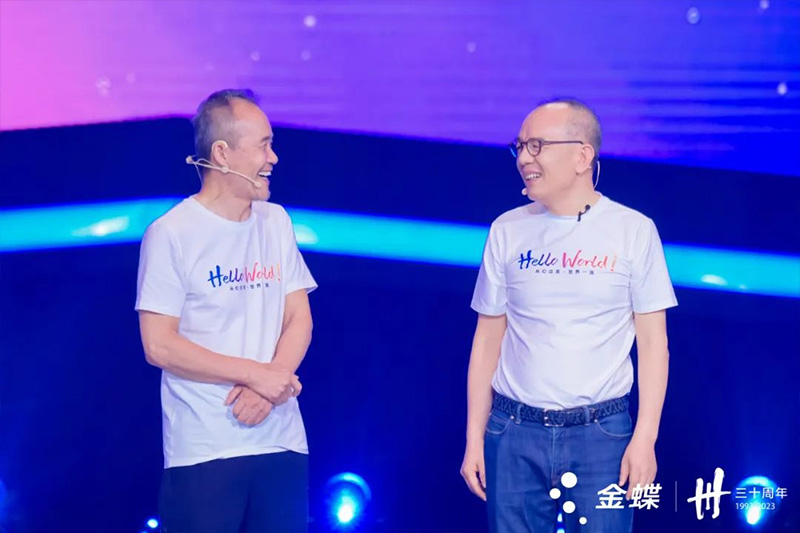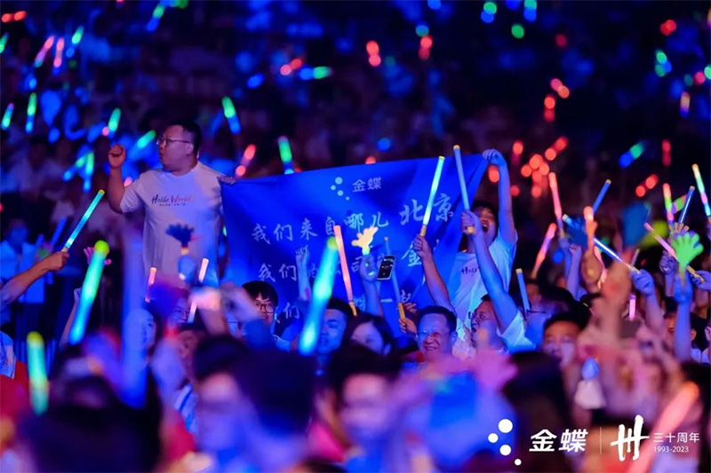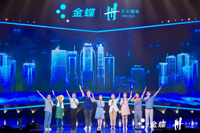 激昂开场之后,是每个金蝶人都熟悉的“蝶厂”厂歌串烧:1993年,有一个年轻人受到毛阿敏《思念》“好像一只蝴蝶飞进你的窗口”启发,创立了金蝶,寓意着自己开发的产品,变成金色蝴蝶飞到财务人员的窗口。30年来,金蝶已帮助1200万会计人员甩掉了算盘,让他们的工作和生活充满阳光。